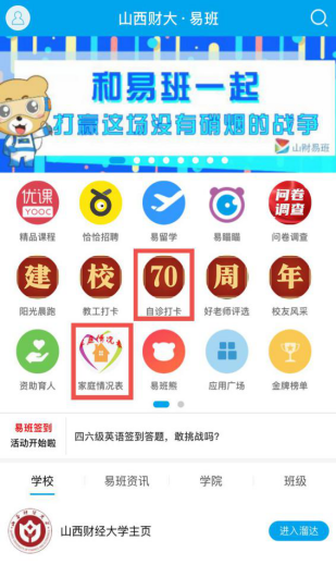 山财易班的“自诊打卡”,要求全校每一位学生根据疫情防控需要,请2021级全体新生按照《2021山西财经大学易班邀请函》要求进行注册,并从8月25日开始在家每天11:30前点击“新生打卡”完成每天的健康打卡,为防疫工作添砖加瓦少不了你的加入!
